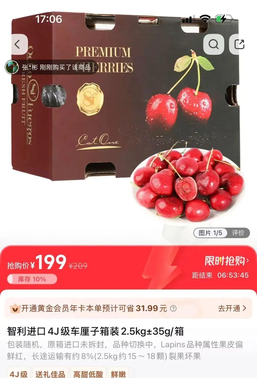 永辉超市、朴朴超市更是打出“劲爆价”,4J级的智利车厘子以199元/箱(2500克)的价格促销,吸引了不少顾客。